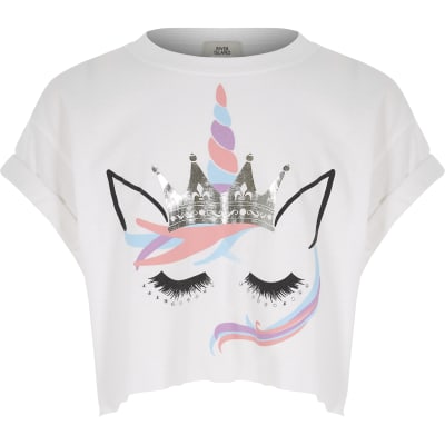 Girls white unicorn print crop T-shirt | River Island