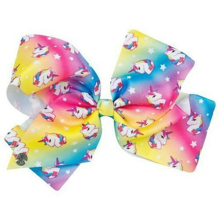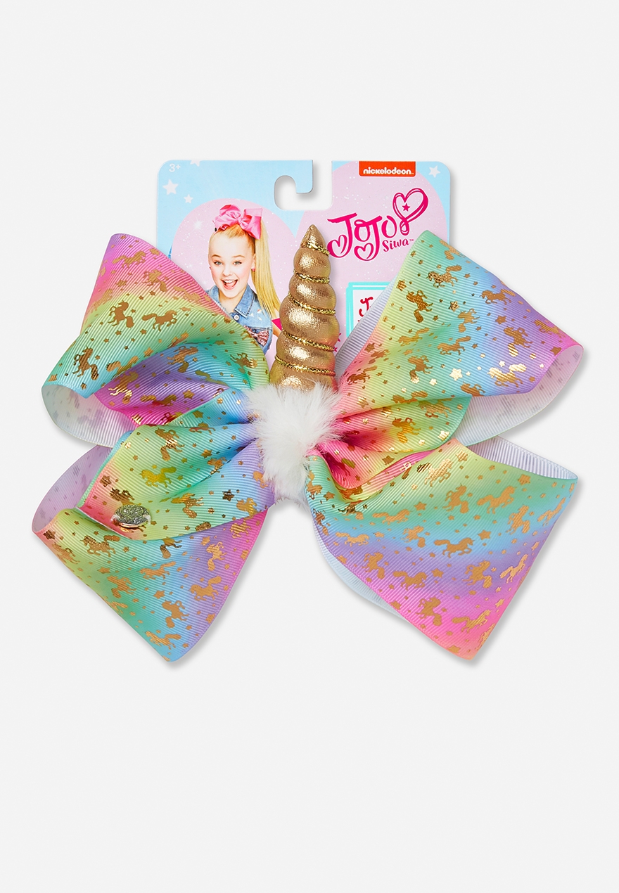 Jojo Unicorn Bow. Super Jojo : Unicorn Challenge Siwa Bow. Over-sized bow features a metallic unicorn horn and unicorn print.