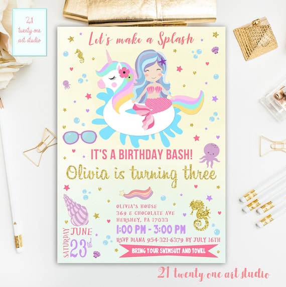 Unicorn Pool Party Invitation Unicorn and Mermaid ...