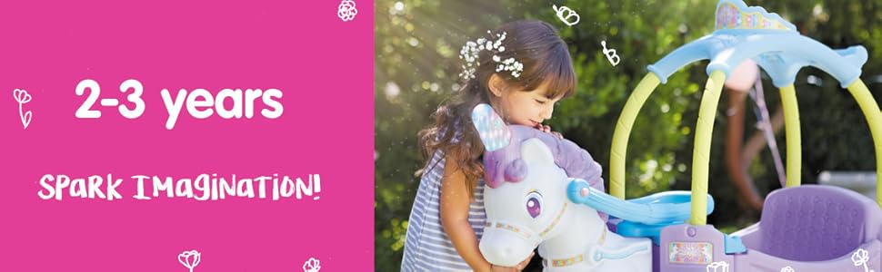 The Magical Unicorn Carriage encourages active play, imagination and developing motor skills. Toddlers will love the unicorn's rotating, light-up horn. Little girls will beam behind the reins of this magical Little Tikes Magical Unicorn Carriage!