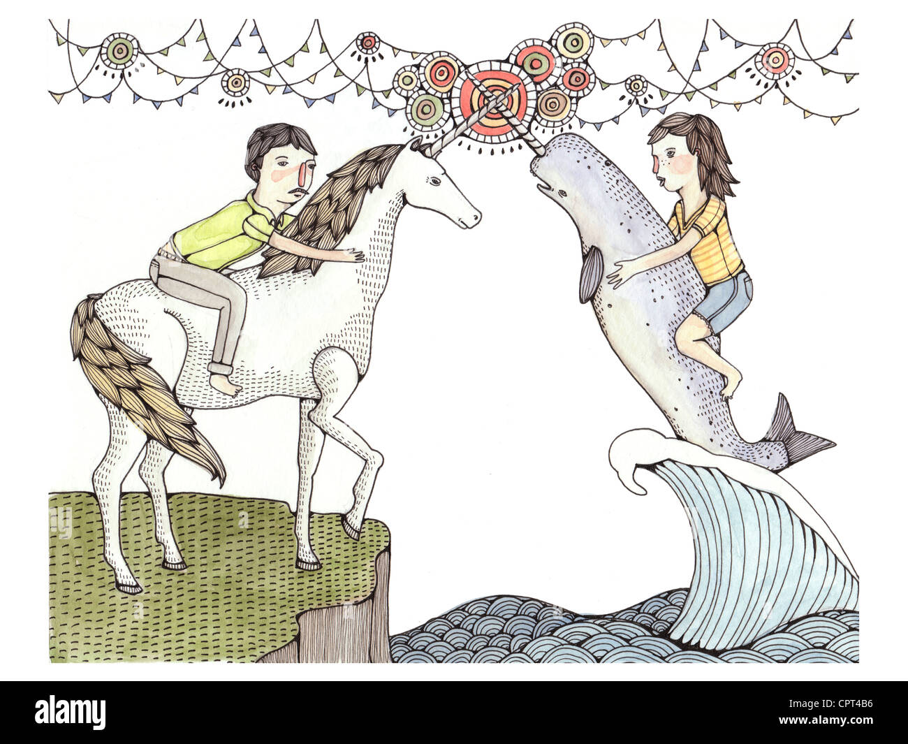 A man on a unicorn and a woman on a beluga whale with a ...